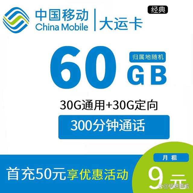 这款移动大运卡9的月租,享受的是全国通用流量30G+全国定向流量30G+全国语音通话300分钟,全国接听是免费的,这款移动卡它的网速和信号都是一流水平,全国不限速,都是高速流量,移动是没有首月免费用,因为性价比是真的高!